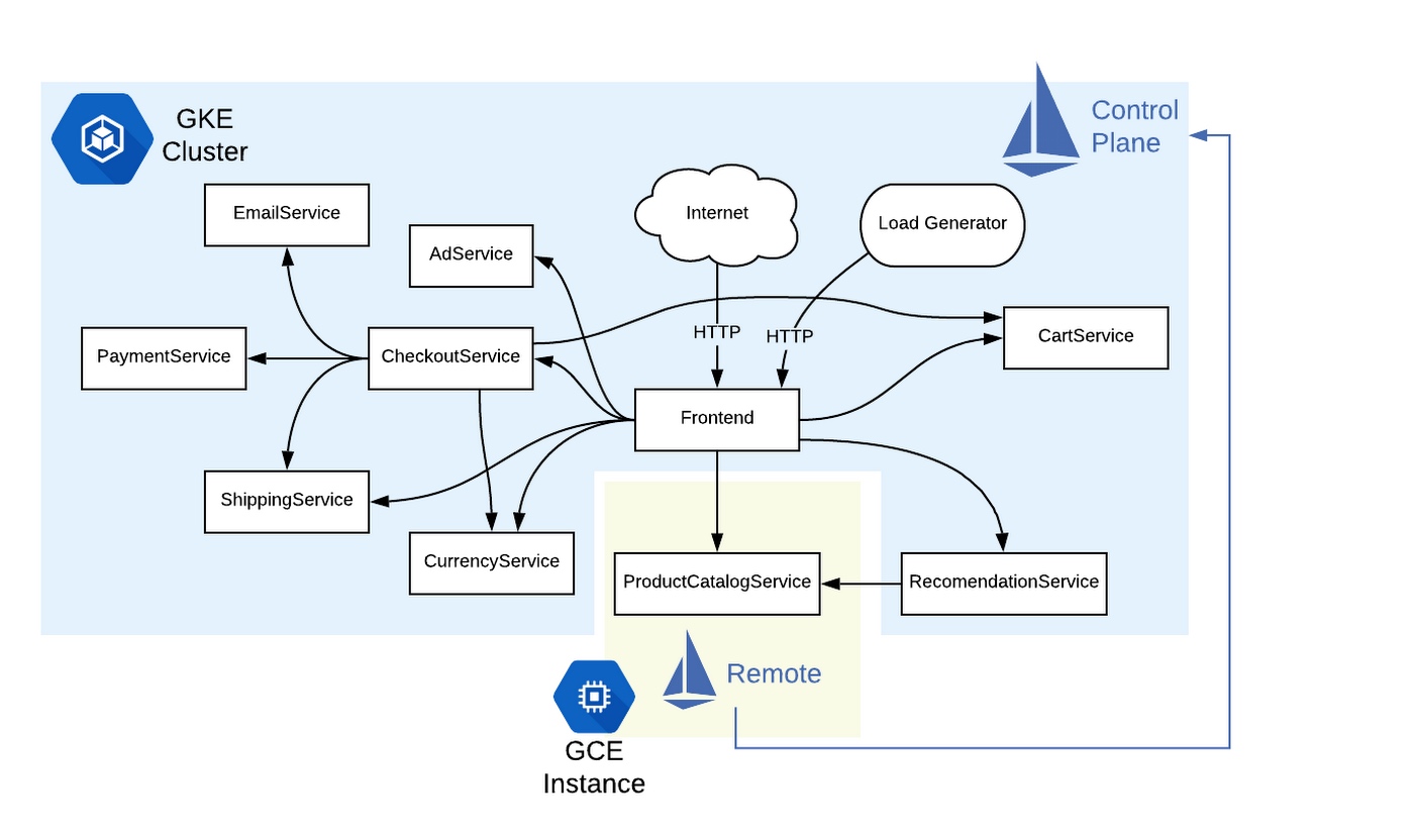 该GCE 虚拟机运行一组最小的Istio组件,以便能够与中心的Istio控制平面通信。然后,我们将Istio ServiceEntry对象部署到GKE集群,该集群在逻辑上将外部ProductCatalog服务添加到网格中。