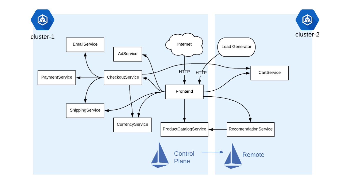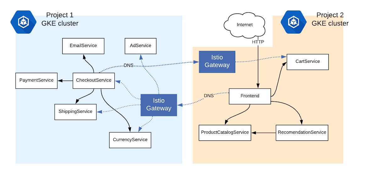 关于这种单一控制平面方法的令人兴奋的事情是,我们不必改变任何有关我们的微服务如何相互通信的信息。例如,前端仍然可以使用本地Kubernetes DNS名称(cartservice:port)调用CartService 。此DNS解析有效,因为同一GCP项目中的GKE pod属于同一虚拟网络,因此允许跨群集进行直接的pod-to-pod通信。