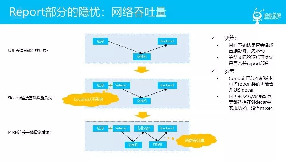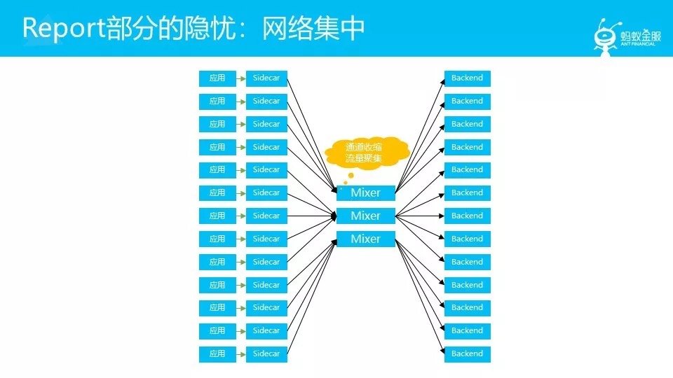 我们还有一部分现在没有合并进来的adapter和mixer,report的这部分。但是这块不是说完全没有问题,我们现在有一个担心,report这块可能会存在一个叫做网络集中的问题。比如说,大家会注意到,应用和Sidecar是一对一部署的,有一万个应用,就有一万个Sidecar。基础设施后端也是多机部署的。
