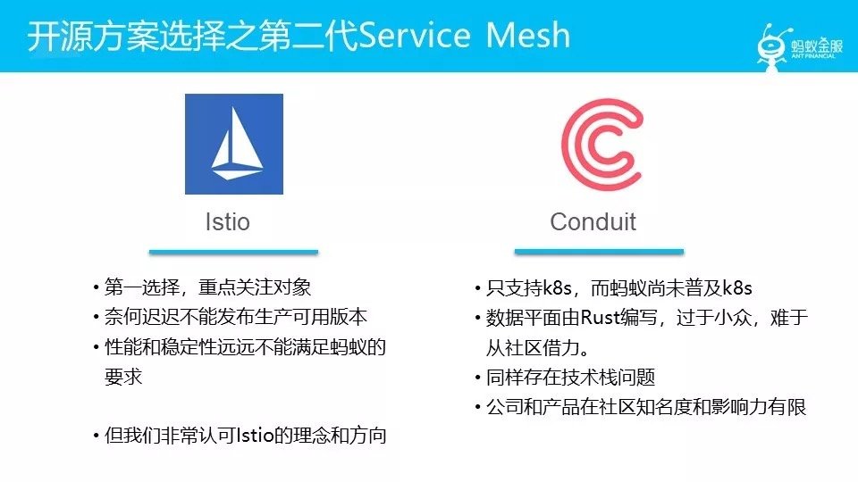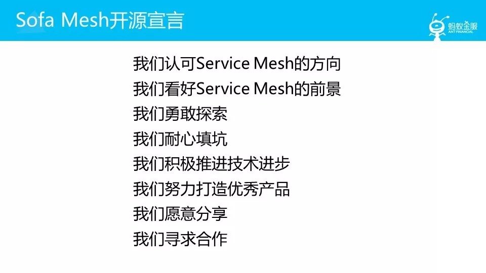 首先我们认可这个大方向,我们看好Service Mesh的前景。体现在什么上呢?我们现在规划,未来整个蚂蚁金服内部的大部分应用都会逐渐的往Service Mesh上落。这个内部已经达成一致了,会往这个方向走。