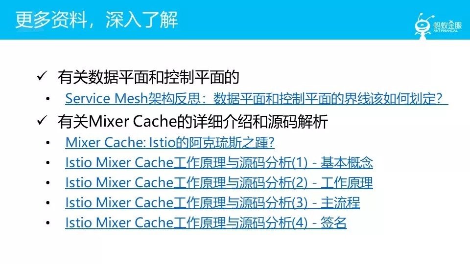 因为时间原因,我们就不再深入去讲,这里我给了一些我博客上的文章。前段时间,我们在做技术选型,在做前面整个架构设计时,在这一点上有些讨论。以及我们最重要的决策:为什么要把Mixer合并进去。细节都在这几篇文章里面,大家如果有兴趣,可以去详细了解。