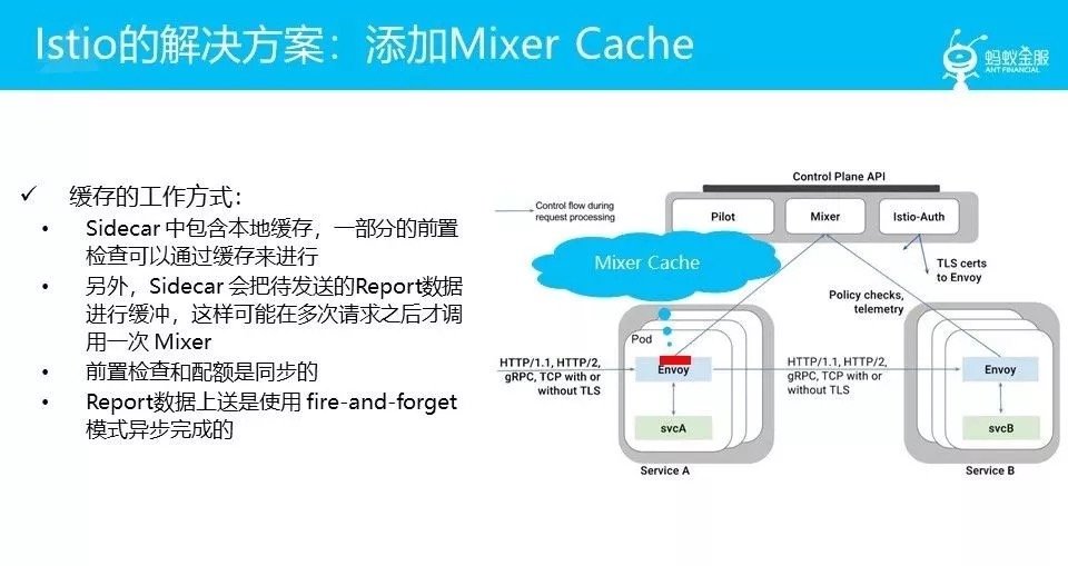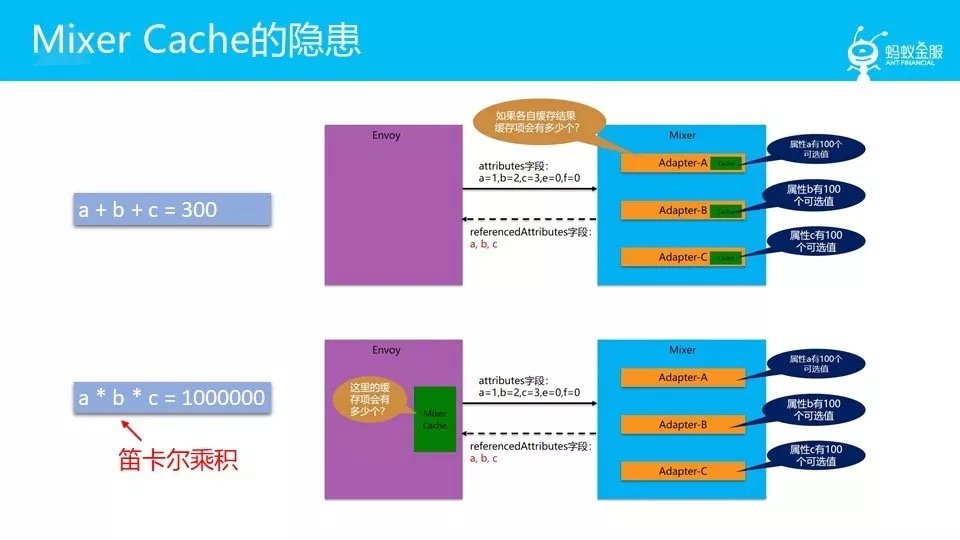 这个问题其实在Istio里面是给了一个解决方案的。最早的时候,Istio 0.1版本中,一出来就发现这个问题。从去年5月份开始到现在,13个月的时间里,他只给了一个解决方案,就是在Mixer上的这个位置加了一个Cache。这个的Cache的想法是:把这些结果缓存在Envoy的内存里面,如果下次的检查参数是相同的,那我们可以根据这样一个缓冲的设计,拿到已经缓存的结果,就可以避免远程调用。这个方式是很理想的,对吧?只要缓存能够命中,那就可以避免这一次远程调用。
