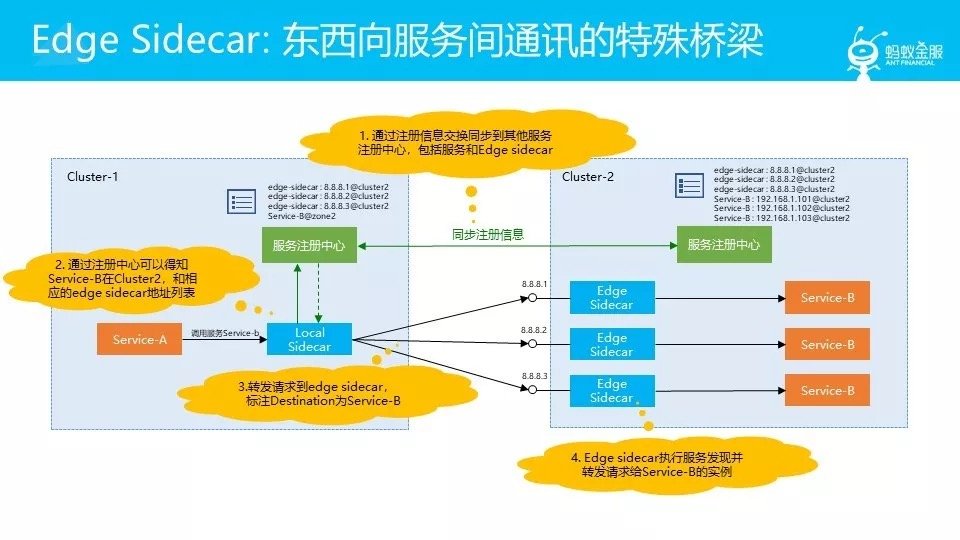 我们计划的Edge Sidecar这个产品,它是东西向服务间通讯的一个特殊桥梁。所谓东西向,大家能理解吧?东西向指服务间通讯,也就是A服务调用B服务。对应的还有南北向,南北向通常是指从外部网络进来调用服务,如走API Gateway调用服务。在东西向通讯中,我们有时会需要一个比较特殊的途径,比如说在这个图中,我们有两个集群,两个集群各有各自的服务注册中心。我们通过增强Pilot的方式打通两个注册中心,可以知道对方有什么服务。