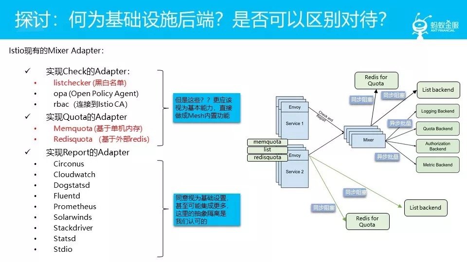 但是下面这些我们是觉得OK的。这些adapter大家有概念吧,prometheus大家应该都接触过的。剩下的这些在国内可能用的不多,是各种日志和metric相关的功能。把这些视为基础设施后端,我们是非常理解的。包括我们内部,我们蚂蚁也有很多这样的系统,相信各位自家的监控方案也是不一样的。