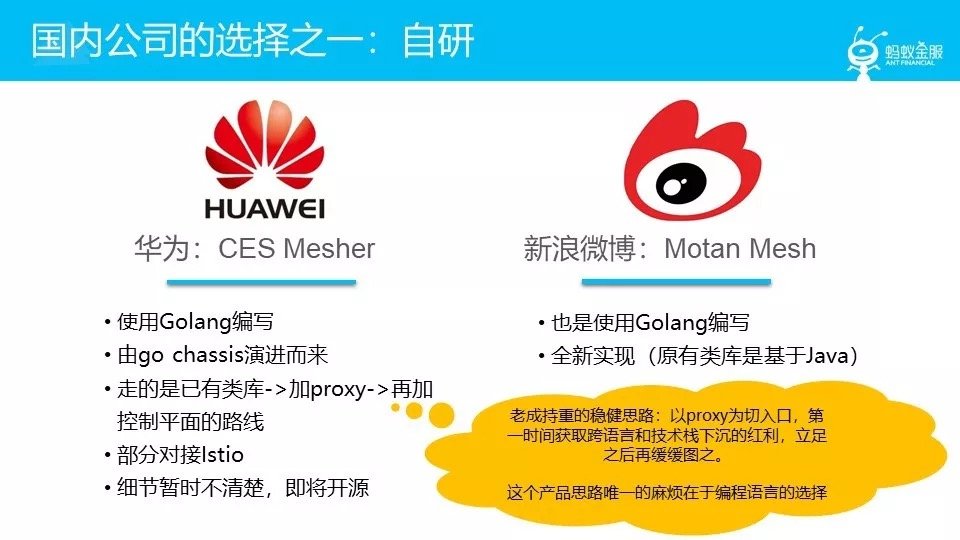 刚才看到的这两个产品,他们的思路大体上是相同的,差异在哪里?就是启动的时候是用已有的类库还是重新写?这两个选择之间最大的麻烦在于编程语言,华为原来有go的类库,所以继续用golang包装一下就好了。但是新浪的类库用的是Java,而sidecar选择的是go语言,所以只能重新做了。
