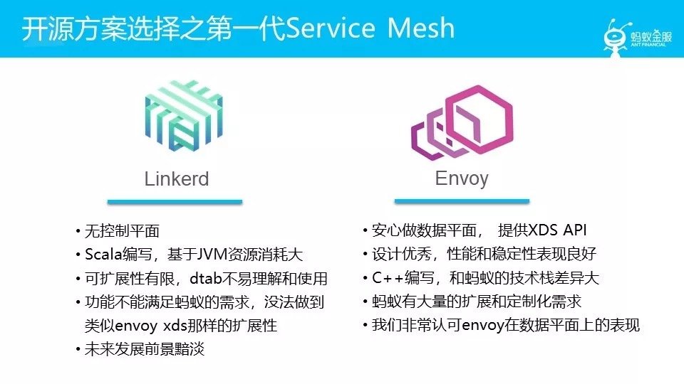 左边的Linkerd,这个基本上,目前看,大家都已经有点嫌弃了。因为它没有控制平面,用Scala写的,基于JVM,资源消耗比较大。它的可扩展性比较有限的,相对于Envoy的扩展性。然后它里面有个dtab,有接触到的同学就会有认识:dtab的语法,非常的不人性,很难理解,使用不太方便。另外它的功能是远远不够的,对于蚂蚁金服来说。另外这个产品本身的发展前景已经很暗淡了,所以这个选项就被淘汰了。
