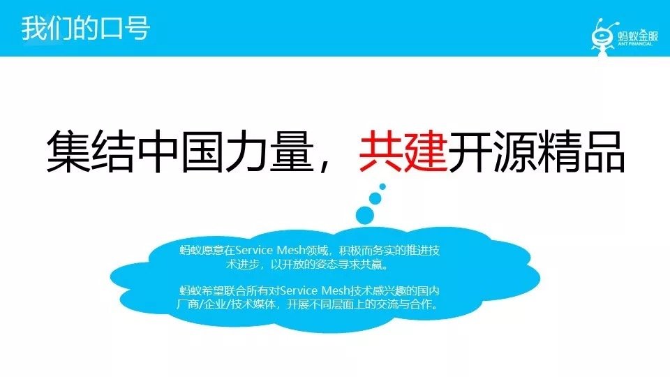 这里我喊一个口号,这个口号有点大,“集结中国力量,共建开源精品”。这里面有个词,比较大一点,我也斟酌了一下,中国这两个字敢不敢用。最后我觉得还是用吧,至少到目前为止,Service Mesh这个技术领域,在全世界目前都还没有成熟的场景落地的情况下,我们目前在这方面的探索,已经是走在最前面的了。