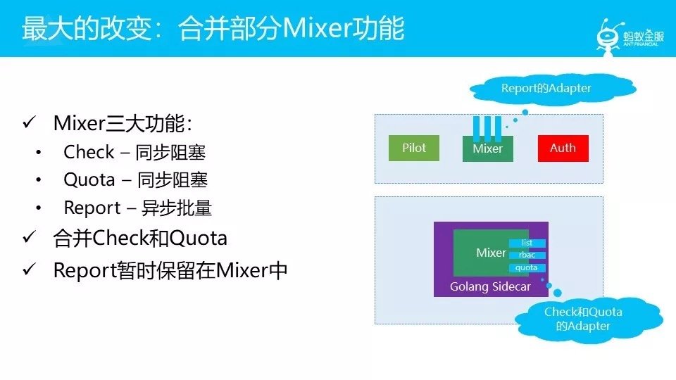 最大的变化在Mixer,其实刚才的Sidecar虽然是全新编写,但是说白了是做Envoy的替换,在架构上没有什么变化。但是第二步的变化就非常大,我们会合并一部分的Mixer功能。