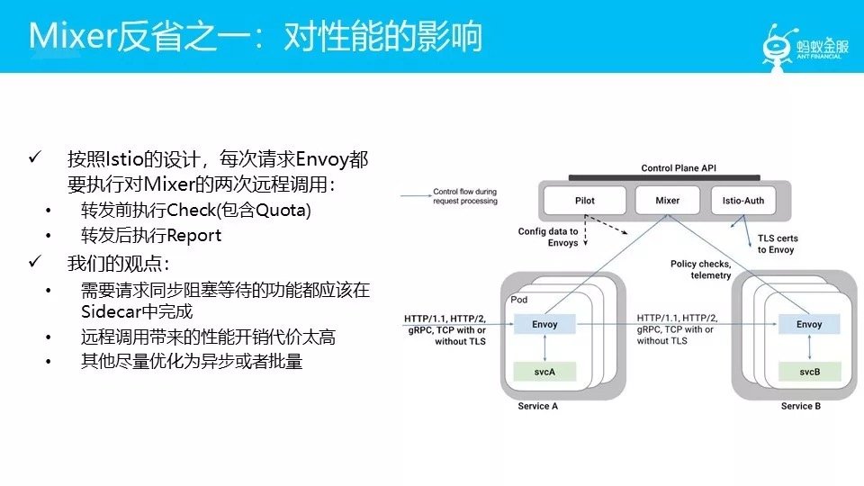 但是Istio的性能是目前最大的问题,而我们有一个重要的前提:大规模应用。要用在蚂蚁金服主站这样一个场景下,性能和稳定性对我们非常非常的重要。第二个问题是它对非k8s的支持不够理想,因为我们还涉及到一个k8s没有完全上线的问题。第三个是和侵入式框架互通的问题,我们内部用的是SOFA,对外推出的时候我们的客户用的可能是Dubbo或者Spring Cloud,Mesh上去之后,两个系统现在走不通,这是大问题。