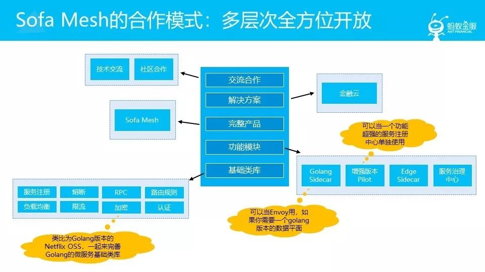 在类库之上,功能模块层面,比如说Golang版本的Sidecar,我们希望它能替换Envoy的功能。在原来使用Envoy的情况下可以使用这个Sidecar来替代。体现在什么层次?就是说,如果想用Envoy,也很喜欢它,但是可能又受限于C++语言栈,更希望是Golang语言栈的时候,可以选择我们这一套。或者如果我们抱有同样的想法,比如想把Mixer合进来,可以在Sidecar这个层面上来重用我们的产品,跟我们做合作。或者我们刚才提到的这个产品,增强版本的Pilot,大家有印象吧?我们会实现一个非常强大的,跨各种集群,各种异构的服务注册机制。然后是Edge Sidecar,在两个不同的区域之间,比如两个不同的机房,IP地址不通的情况下,帮你打通服务间调用。这些功能模块,会以单独的产品和项目出现,你可以在某一个产品上跟我们合作。