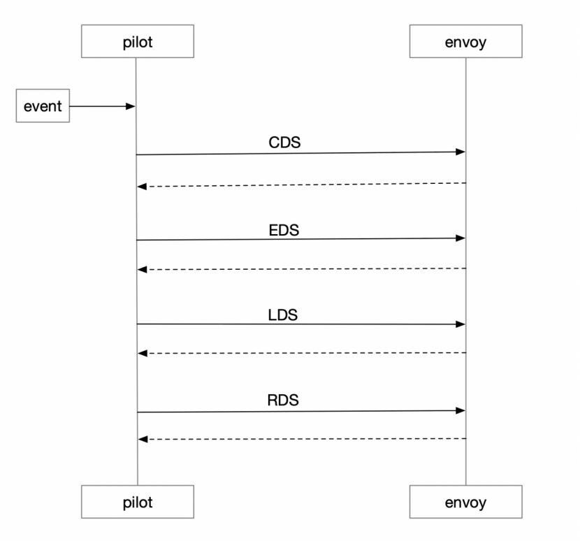 Istio中的流量管理策略是通过Pilot统一管理下发给Envoy的,Envoy作为数据面,对外提供XDS接口。为了保证最终一致性,Pilot实现了Envoy提供的ADS(Aggregated Discovery Service)接口,执行顺序为:CDS, EDS, LDS, RDS。Pilot本身是无状态的,所有的资源配置全部以CRD实例的形式保存在Kubernetes集群上,Envoy和Pilot连接建立完成以后,Pilot以事件通知的形式触发推送,Envoy配置更新生效。