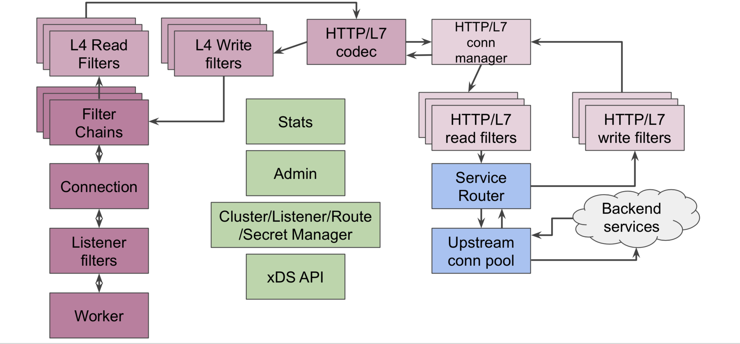 L4 filter主要包括:HTTP connection manager, MySQL proxy, Rate limit, RBAC, Redis proxy, TCP proxy等。L7 filter是L4 filter中HTTP connection manager下面定义的filter, 主要包括:CORS, External Authorization, Fault Injection, Health check, JWT Authentication, Lua, Rate limit, Router等。无论L4还是L7的filter都是按照指定的次序执行,istio中使用的istio-proxy也是在envoy的基础上额外编译进了istio_authn,mixer等filter, 以实现istio中的policy和telemetry等功能。