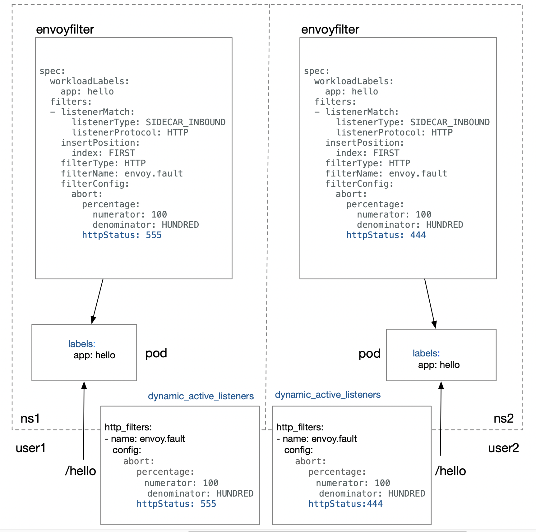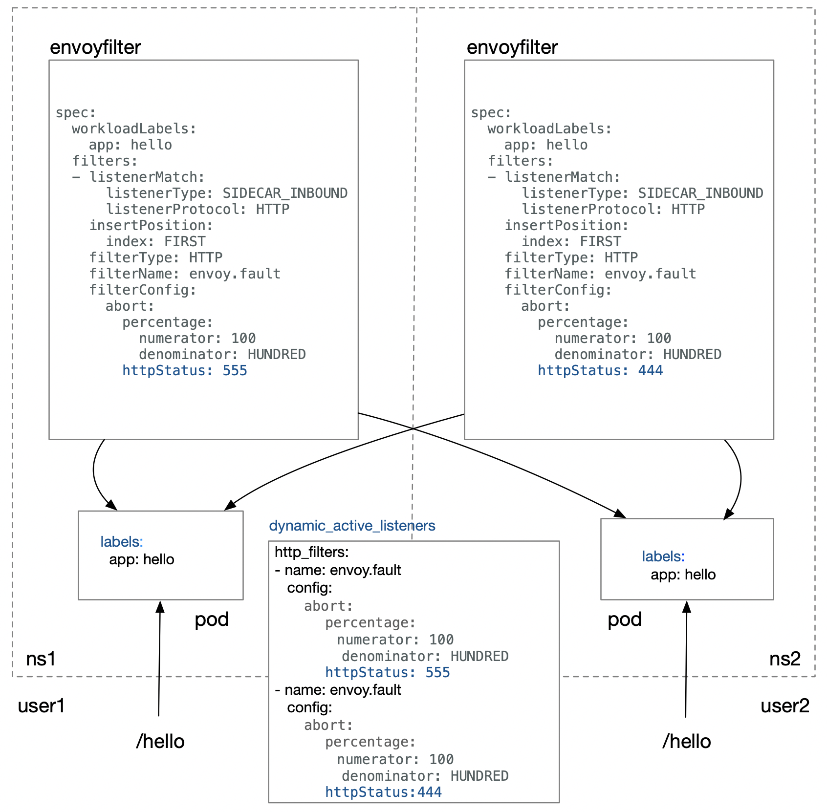 如果图中的两个用户user1和user2,分别在对应的namespace下面部署两个具有相同标签的pod,绑定不同的EnvoyFilter,返回码应该分别为555(user1)和444(user2)。但user2访问/hello得到的最终返回码是555,与预期444不符,其行为被user1干扰了。 原因就在于缺少namespace级别的隔离。