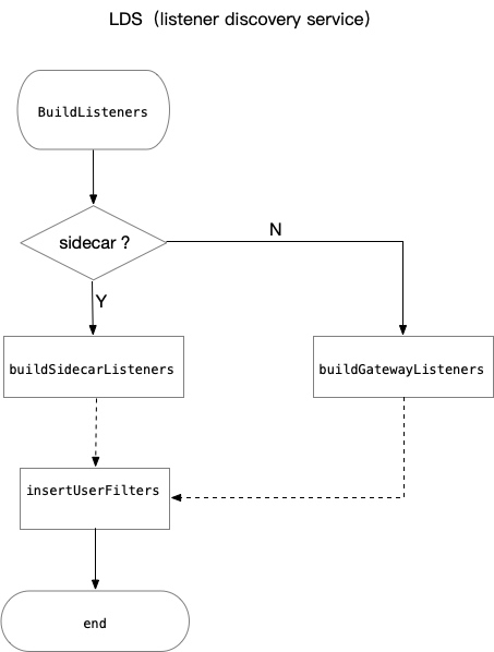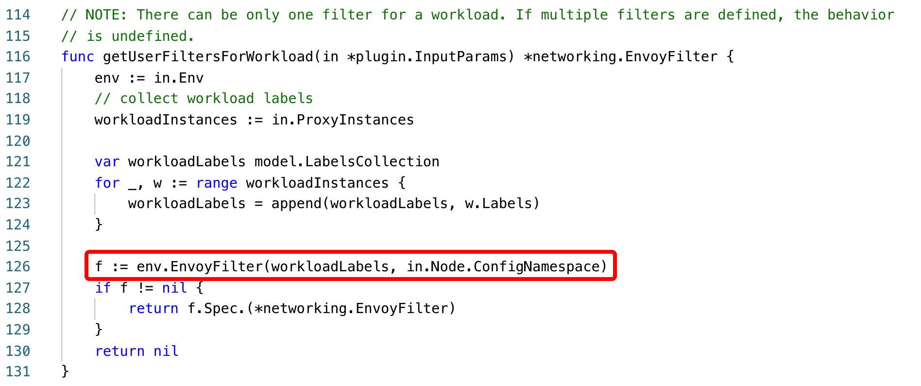insertUserFilter是在监听器配置完成之后执行的,用于向envoy filter chain中插入用户自定义的filter。insertUserFilter会调用下图中的getUserFiltersForWorkload函数,在整个集群范围内查找满足条件的EnvoyFilter,把获取到的filter合并后插入到监听器的filter chain中。