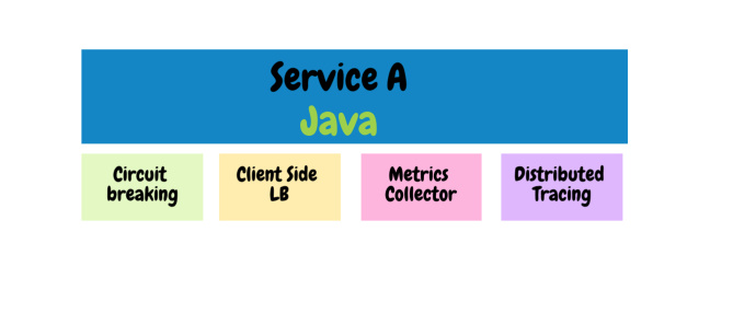 现在,为了满足这些最佳实践的唯一方法是在每个微服务上使用一个客户端库来解决每个问题。所以每个服务的结构看起来就像这样。